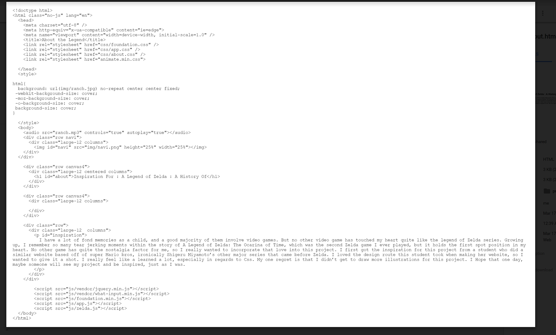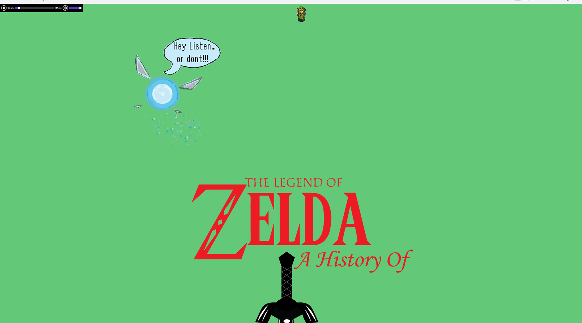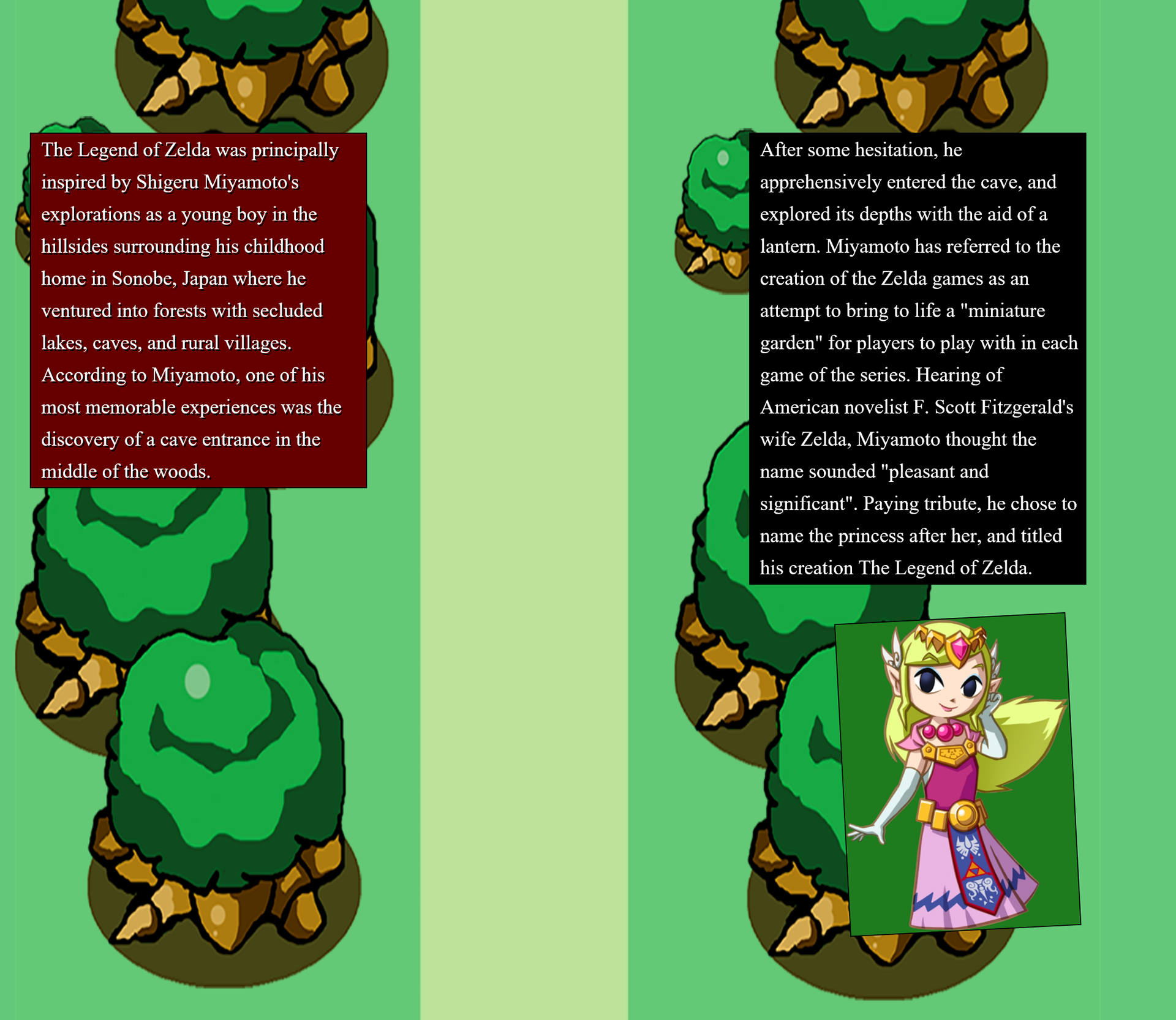 This website is a long scrolling infographics page explaining the history of "The Legend of Zelda" video game series. The website has you controlling a Link sprite, who is the protagonist, as he walks through the forest exploring the game info. The website also has an inspiration page. All the images on the page are coded to move and animate using CSS. The code is built using Html and CSS. The fonts and colors are inspired by the video game series. I illustrated the logo as well as the fairy at the top of the page.